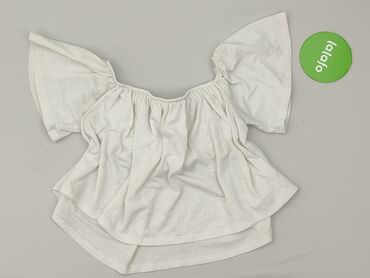 Biała bluzka hiszpanka z krótkim rękawem i wiązaniem - Krój: hiszpanka – szeroki dekolt opuszczany na ramiona, falbana wokół dekoltu - Rękaw: krótki, lekko bufiany - Dół: przedłużony z troczkiem d...