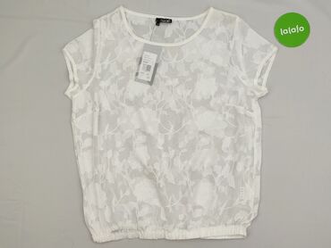 Biała bluzka damska z krótkim rękawem - Luźny, lekko kimonowy krój - Dekolt w kształcie łódki - Ażurowe, koronkowe wstawki na ramionach i rękawkach z motywem kwiatowym - Dół zakończony delikatną gu...