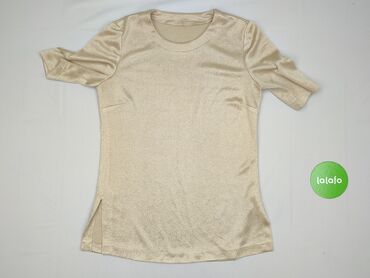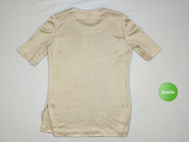 Bluzka damska z lekko połyskującej tkaniny w kolorze szampańskiej perły. - Krój: prosty, swobodny - Dekolt: okrągły - Rękaw: krótki - Tył: małe rozcięcie z zapięciem na guzik - Materiał: gładki, d...