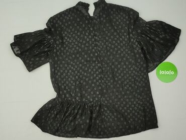 Bluzka damska H&M - Krój: koszulowy, zapinana na guziki z przodu - Rękaw: krótki - Kołnierzyk: klasyczny - Wzór: drobne czarno‑białe kropki/„stempelki” na białym tle, gęsty deseń all-over - Materi...