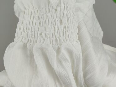 Bluzka damska z krótkim rękawem w kolorze ecru/śmietankowym. - Fason: luźny, lekko wydłużony dół z zaokrąglonymi brzegami; rozcięcia po bokach. - Kołnierz: stojący, asymetryczna listwa zapięcia. -...