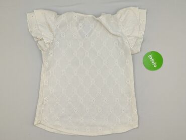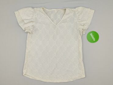 Damska bluzka dzianinowa w kolorze ecru/kremowym. - Krój: prosta, z dekoltem w kształcie litery V - Rękawy: krótkie, ażurowe (koronkowy splot z geometrycznym wzorem); ażurowe wykończenie także prz...