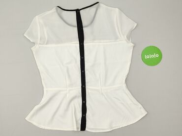 Bluzka damska z drobnym wzorem w kropki - Kolor: biały z drobnymi czarnymi kropeczkami - Krój: lekko dopasowany, z delikatnie zaokrąglonym dołem - Rękaw: krótki, przylegający do ramion (motylek/ki...