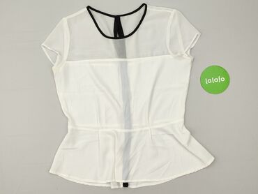 Bluzka damska z baskinką - Kolor: biały z subtelnym, pionowym żakardowym wzorem w odcieniach jasnoszarych - Krój: luźna góra, odcięcie w talii i falbaniasta baskinka nadająca lekkości - Rękawy: kr...