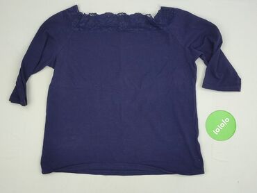 Bluzka damska z długim rękawem, granatowa - Fason: lekko luźny, z elastycznym dołem - Dekolt: okrągły - Rękawy i karczek: koronkowe w ażurowy wzór z kółkami - Materiał korpusu: miękki, cienki dżer...