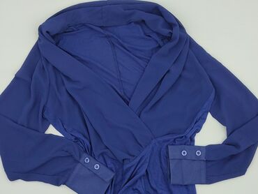 Bluzka damska w kolorze kobaltowym - Krój: luźny, lekko zaokrąglony dół - Dekolt: w kształcie litery V z krótką stójką - Rękawy: długie; na obu rękawach wszyte paski z guzikiem do podpinania (możl...Stan: