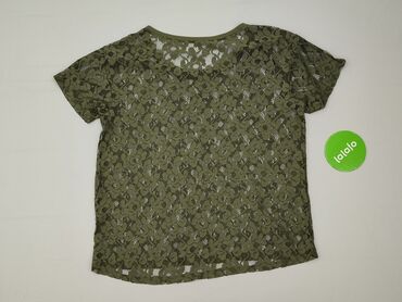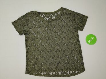 Bluzka damska z koronką, rozmiar L - Krój: luźna, lekko przedłużona koszulka z krótkim rękawkiem/cap sleeve - Kolor: przygaszona zieleń (szarozielony) - Dekolt: okrągły, bogato zdobiony ażurową ko...