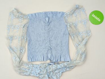 Bluzka hiszpanka w kolorze jasnobłękitnym. - Fason: odkryte ramiona z szeroką, marszczoną listwą i wiązaniem z przodu na troczki - Rękawy: długie, bufiasto-marszczone, zakończone szerokim ściągacz...Stan: