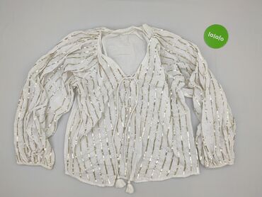 Biała bluzka damska z długim rękawem, wyróżniająca się dekoltem w kształcie litery V, ozdobionym srebrnymi cekinami. Bluzka charakteryzuje się luźnym fasonem i delikatnie marszczonym materiałem, co...