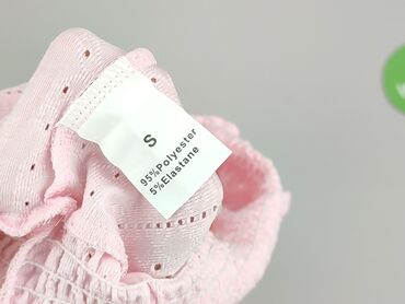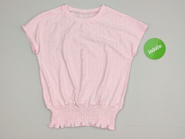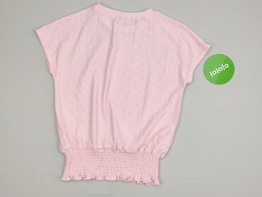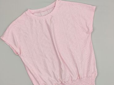 Bladoróżowa bluzka z krótkim rękawem - Fason: prosty, lekko luźny, z rozcięciami po bokach u dołu - Dekolt: okrągły - Rękawy: półtransparentne, z delikatnej siateczkowej dzianiny - Przód: ażurowe ...Stan: