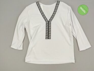 Biała bluzka damska z dekoltem w kształcie litery V. - Prosty, luźniejszy krój z delikatnie wydłużonym tyłem i rozcięciami po bokach. - Rękawy 3/4 z możliwością podpięcia (patki na guzik). - Miękk...