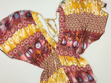 Bluzka damska BEL&BO, rozmiar M. - Kolorystyka: fiolet, pomarańcz, biel; wzór kwiatowo-abstrakcyjny w stylu retro. - Krój: dekolt w serek, lekko dopasowana talia. Krótkie, szerokie, transparentne ...