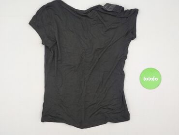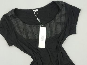 Bluzka damska Solar, rozmiar S. - Kolor: czarny, delikatnie połyskująca dzianina. - Fason: asymetryczny – jedno ramię odkryte, drugie z rękawem 3/4. - Dekolt na jedno ramię z długimi troczkami do z...
