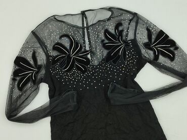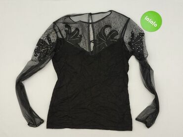 Elegancka czarna bluzka z transparentnej siateczki u góry i na rękawach. Przód i tył z nieprześwitującym korpusem w kształcie serca. Długie, lekkie rękawy. Ozdobiona dużymi, aksamitnymi kwiatowymi aplikacjami oraz drobnymi połyskującymi kamyczkami/kropkami na biuście i rękawach. Z tyłu zapięcie na mały guzik przy szyi. Dopasowany krój podkreślający sylwetkę.