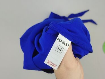 Bluzka damska Pepco, rozmiar 38. - Krój: luźny, prosty, z krótkim rękawem typu motylek - Dekolt: wiązany troczkami zakończonymi frędzlami - Wzór: gęsty, ornamentalny motyw w odcieniach granatu, ni...