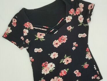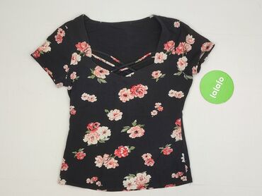 Bluzka damska EXHIBIT S/M – czarna w stokrotki z białym kołnierzykiem - Marka: EXHIBIT - Rozmiar z metki: S/M - Fason: prosta, lekko dopasowana - Rękaw: krótki - Wzór: gęsty print w białe stokrotk...
