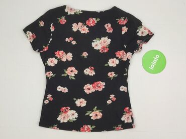 Bluzka damska z krótkim rękawem - Kolor: czarny z przodem w kontrastowy biało‑czarny, roślinny/ornamentalny print - Krój: dopasowany, z wcięciem w talii i dekoltem w kształcie litery V - Rękawy: p...Stan: