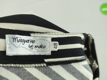 Bluzka damska Rene Sou, rozmiar 48 - Fason: lekko taliowana, z marszczeniem pod dekoltem i w pasie, krótkie rękawki - Wzór: szerokie poziome pasy w odcieniach fioletu, czerni i bieli - Dekolt: okr...Stan: