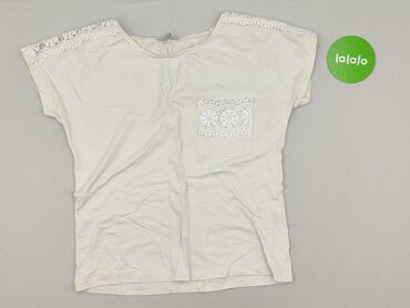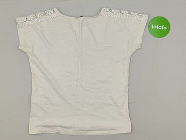 Biała bluzka damska z krótkim rękawem - Luźny, lekko kimonowy krój - Dekolt w kształcie łódki - Ażurowe, koronkowe wstawki na ramionach i rękawkach z motywem kwiatowym - Dół zakończony delikatną gu...