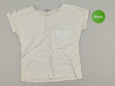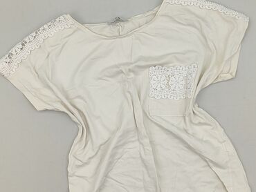 Ażurowa bluzka damska w kolorze ecru/kremowym. - Krój: luźny, z krótkim rękawem typu nietoperz. - Materiał: 95% wiskoza, 5% elastan (metka ze składem widoczna na zdjęciu). Delikatna, elastyczna dz...Stan: