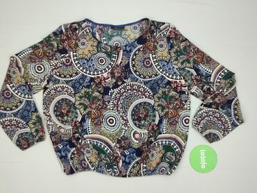 Bluzka damska z długim rękawem, rozmiar 2XL. - Kolorystyka: czerń z intensywnymi niebieskimi przejściami i fioletowo-białym, dekoracyjnym nadrukiem przy dekolcie i ramionach. - Fason: lekko rozsze...