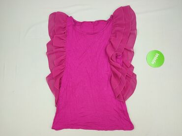 Bluzka damska w kolorze intensywnego fuksji. - Krój: luźny, z marszczeniem pod dekoltem - Dekolt: szeroki, zaokrąglony - Rękaw: do łokcia - Rozmiar z metki: M - Skład materiału: 96% wiskoza, 4% el...