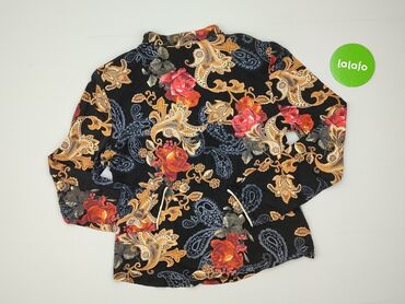 Bluzka damska z długim rękawem, zapinana na guziki. - Fason: lekko taliowana, stójka przy szyi - Wzór: artystyczny, łączący pasy i motywy kwiatowe w odcieniach niebieskiego, zieleni, beżu oraz ak...