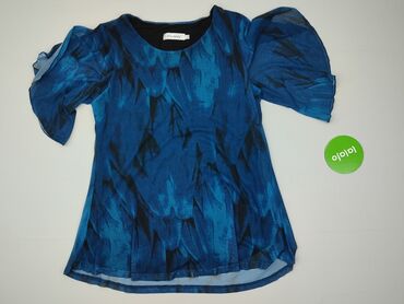 Bluzka damska z lekkiego, półprzezroczystego materiału z kolorowym, geometrycznym nadrukiem. - Krój: luźny, z delikatnym wcięciem w talii; dół i dekolt wykończone czarną lamówką. - Rękawy: krótkie...