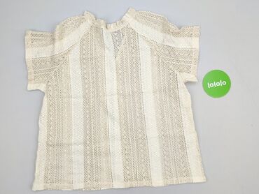 Biała bluzka damska z krótkim rękawem - Krój: luźny, odcięcie pod biustem z lekkim marszczeniem z przodu i z tyłu - Dekolt: okrągły - Detale: beżowa falbaniasta lamówka w linii odcięcia; ozdobne p...