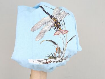 Bluzka damska z krótkim rękawem, biała w kolorowy wzór owadów (ważki, żuki, motyle) w odcieniach niebieskiego, fioletu i pomarańczu. - Fason: luźny, lekko przedłużony dół, okrągły dekolt z marszcz...