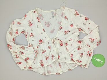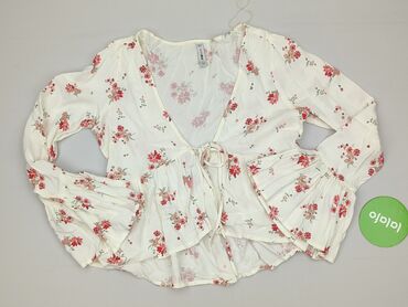 Biała bluzka damska marki FB Sister, w rozmiarze M. Charakteryzuje się dekoltem w kształcie litery V z ozdobnym wiązaniem, które dodaje jej lekkości. Bluzka posiada długie, rozszerzane rękawy, zako...