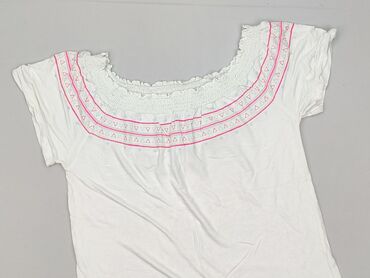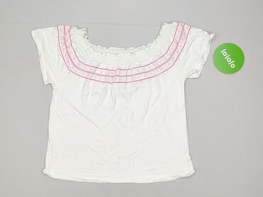Bluzka damska off-shoulder w kolorze białym, rozmiar 38 (metka: WOMEN 38). - Krój hiszpański: odkryte ramiona z dwiema wąskimi ramiączkami. - Dekolt zdobiony szeroką koronkową aplikacją w motywy kw...