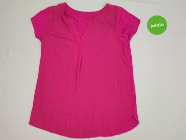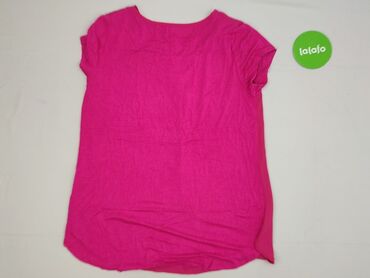 Bluzka damska w intensywnie różowym kolorze (fuksja). - Krój: prosty, lekko luźny, z krótkim rękawem - Dekolt: okrągły - Długość: klasyczna; tył minimalnie dłuższy niż przód - Materiał: lekka, zwi...Stan: