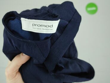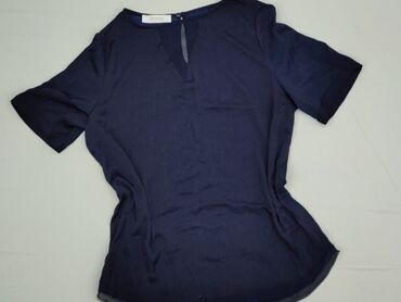 Granatowa bluzka damska C&A - Rozmiar: EU 44 (FR 46) - Krój: kopertowy z asymetrycznym dołem - Zapięcie: rząd oblekanych materiałem guzików z przodu - Rękawy: krótkie, bufiaste z delikatną gumką p...