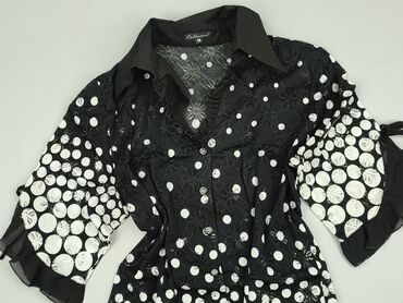 Damska bluzka w kropki, wiązana, rozmiar EU 34 (US 4) - Kolor: czarny w białe groszki (mix drobnych i większych kropek) - Fason: lekko prześwitująca, zapinana/wiązana z przodu z falbaną wzdłuż zap...