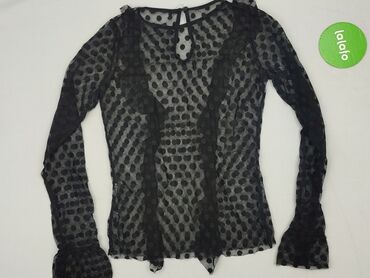 Czarna bluzka w białe groszki, damska, rozmiar S (small). - Fason: dopasowany do talii, delikatne marszczenia z przodu, lekko falujący dół. - Dekolt: w kształcie litery V. - Rękawy: długie. ...