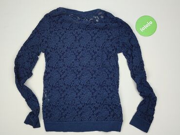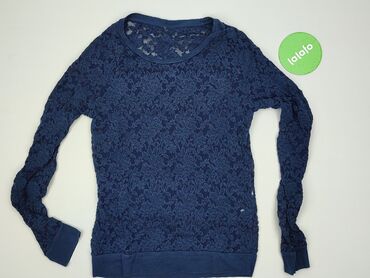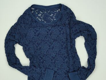Bluzka damska z długim rękawem, granatowa - Fason: lekko luźny, z elastycznym dołem - Dekolt: okrągły - Rękawy i karczek: koronkowe w ażurowy wzór z kółkami - Materiał korpusu: miękki, cienki dżer...