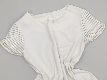 Bluzka damska w kolorze białym z krótkim rękawem. Gładki przód i tył, dekoracyjne rękawy z ażurowymi, poziomymi paseczkami (prześwitujące wstawki). Okrągły dekolt. Dół asymetryczny – z tyłu dłuższy, z niewielkim rozcięciem pośrodku. Lekka, miękka tkanina o subtelnie ziarnistej fakturze, miła w dotyku i ładnie się układa. Uniwersalny, elegancko-casualowy fason – sprawdzi się do jeansów i spódnic, na co dzień i na wyjścia. Kolor: biały. Dla: kobieta.