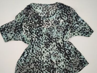 Bluzka damska z lekkiego, zwiewnego materiału w wielobarwny, abstrakcyjny print (odcienie niebieskiego, zieleni, beżu i czerni). - Fason: luźny, tunikowy, z odcięciem w talii i delikatnymi marszc...Stan: