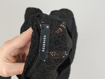 Czarna damska bluzka Reserved, rozmiar 36. - Krój prosty, z delikatnie przedłużonym dołem i krótkim rękawkiem typu cap. - Okrągły dekolt. - Z przodu pas z półprzezroczystej tkaniny ozdobiony rzęde...