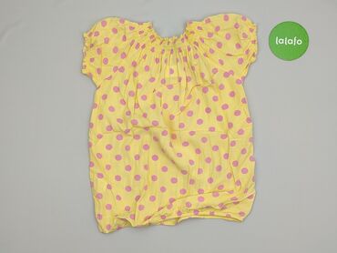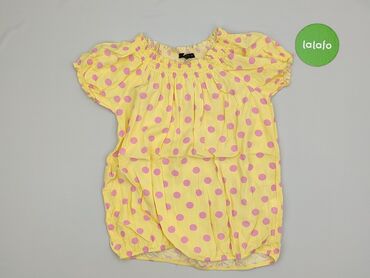 Bluzka damska w kropki – pastelowa żółć - Krój: prosty, lekko luźny, z krótkim rękawem. - Dekolt: okrągły. - Ozdoby: pionowa listwa na środku przodu z małą granatową kokardką i srebrną aplikacją. ...
