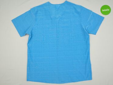 Koszula damska z krótkim rękawem w kolorze lawendowo–niebieskim. - Krój: lekko rozszerzany ku dołowi, zapinana na pięć ozdobnych guzików przypominających biżuterię. - Dekolt: w kształcie litery ...