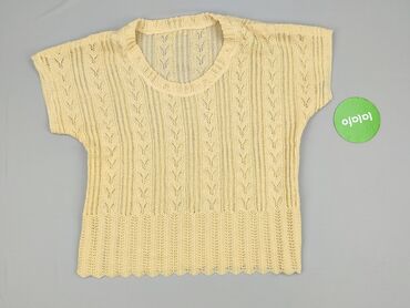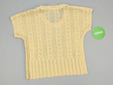 Przewiewny, ażurowy top damski w kolorze pastelowej żółci. - Krój: krótki (crop), luźny, z delikatnym marszczeniem/przeszyciem z przodu. - Dekolt: w kształcie litery V z przodu i z tyłu. - Rękaw: ...