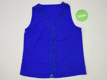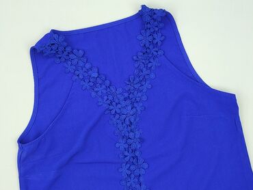 Bluzka bez rękawów w kolorze intensywnego kobaltu. - Fason: luźny, lekko rozkloszowany ku dołowi - Dekolt: w kształcie V z przodu, bogato zdobiony szeroką, szydełkową koronką w jaśniejszym, błękit...