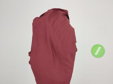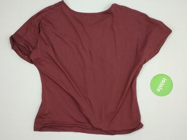 Bluzka damska, kolor bordowy/ciemne wino. Luźny fason z krótkim rękawem typu kimono, okrągły dekolt. Przód z efektownym zakładaniem/supłem przy dole, tył gładki. Materiał elastyczny i miękki: 95% poliester, 5% elastan (metka na zdjęciu). Rozmiar z metki: L.