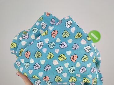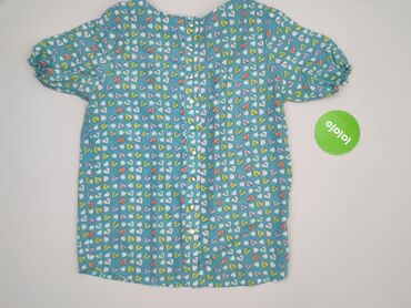 Bluzka damska z krótkim rękawem, w drobny, pastelowy wzór listków na turkusowym tle. Lekka, przewiewna tkanina o delikatnym, gładkim chwycie. Luźny, prosty krój z zaznaczoną talią troczkiem/ściągaczem po bokach, okrągły dekolt. Rękawy bufiaste z delikatną gumką przy krawędzi. Zapięcie z tyłu na rząd małych guzików.