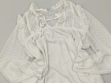 Bluzka damska Cropp - Kolor: biały - Rozmiar z metki: S - Skład: 100% wiskoza - Fason: lekko luźny, z dłuższym tyłem - Dekolt w kształcie litery V z wiązaniem i falbanką - Długie rękawy zakończone...Stan: