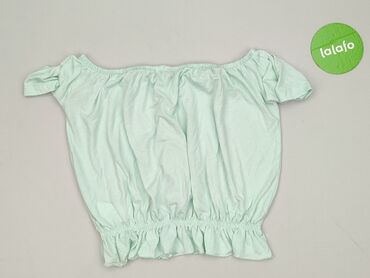 Bluzka Sinsay, rozmiar M - Krój: krótka bluzka typu crop, z elastycznym dołem i marszczeniem przy dekolcie - Rękawy: krótkie, bufiaste - Dekolt: okrągły z delikatną falbanką i wiązaniem z przodu -...