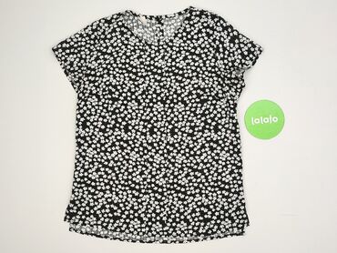 Czarna, lekka bluzka damska z kwiatowym nadrukiem - Wzór: duże, wielobarwne kwiaty (odcienie różu, brzoskwini, zieleni) na czarnym tle - Krój: luźny, przewiewny, z krótkim rękawem; delikatnie zwęż...