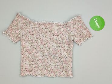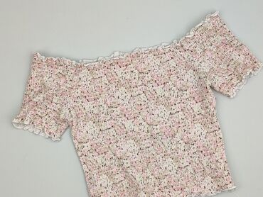 Bluzka damska Page One, rozmiar L/XL - Kolor: pudrowy róż - Fason: luźny, z doszytą falbaną u dołu, krótki rękaw, okrągły dekolt - Przód: duża aplikacja litery „M” z ozdobnymi perełkami na tle kwi...